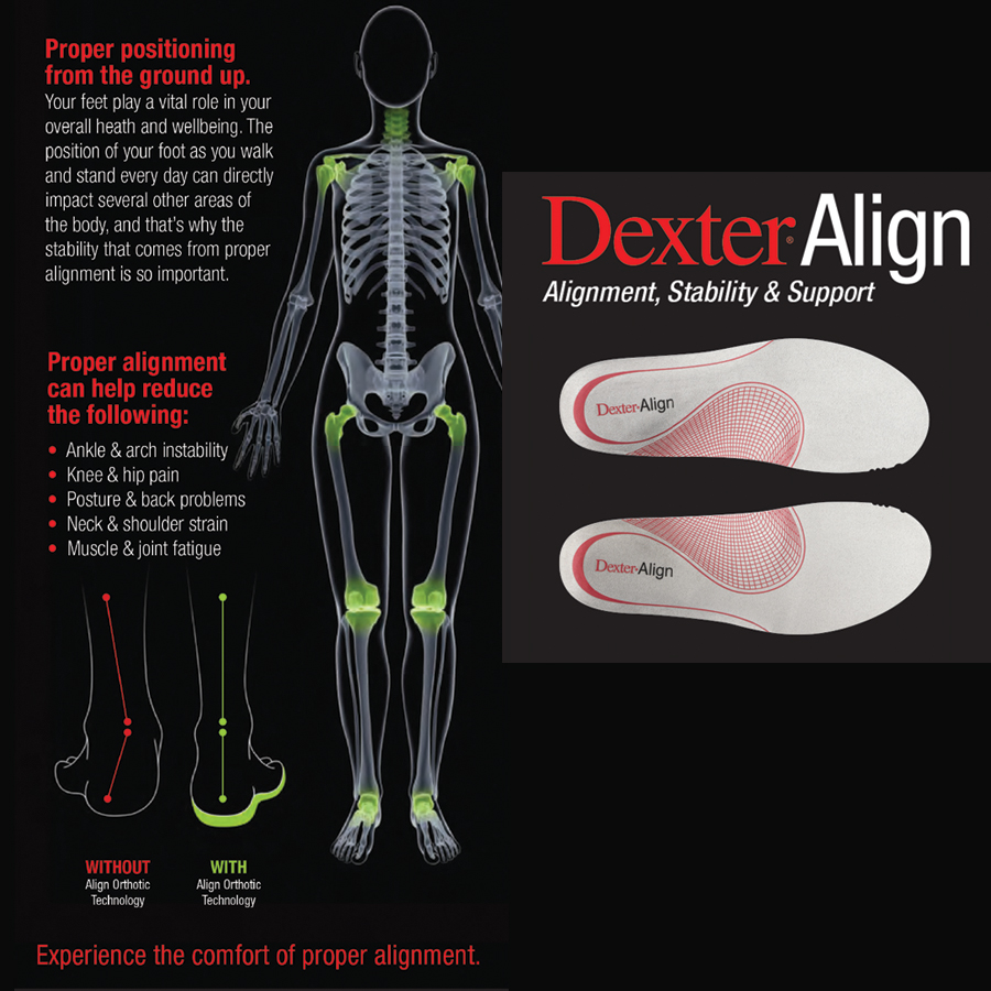 Dexter’s Align™ is an innovative, ergonomically designed orthotic created to help promote proper positioning, from the ground up. Its firm yet flexible surface helps place the foot in a more optimum position to assist with the support and stability that are key to your game, and everyday well being.