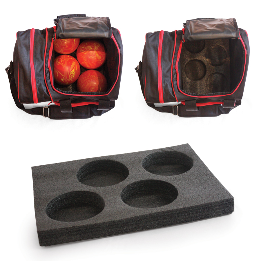 In the tenpin bowling world, there are many different styles of single ball bag offered. We decided to create two (2) foam inserts in order to convert these types of bags into a small ball bag, where the single ball bag can hold up four (4) small balls. This gives the duckpin, fivepin or candlepin player a lot more choices in colour and style.