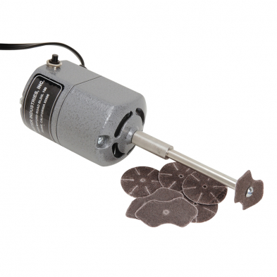 High-speed electric sander with grounded cord and an assortment of 50 sanding discs. Push-type momentary switch. Perfect for smoothing out finger and thumb holes and beveling edges. 110V motor.