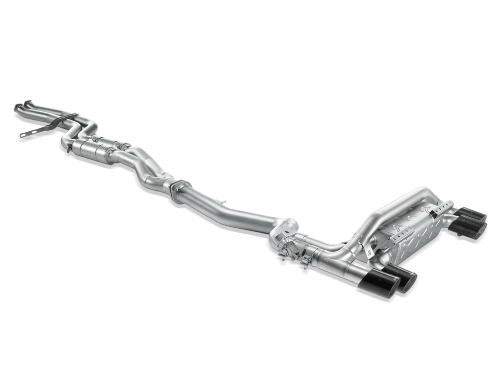 Our Evolution performance exhaust system, made of our proprietary titanium, includes a muffler, link pipes, and resonators that run from the stock down pipes back. These link pipes feature larger-than-stock-diameter tubing and cast titanium flanges. The secondary catalytic convertors are removed, further decreasing back pressure and weight while at the same time deepening the exhaust tone and increasing power output. For the ultimate in weight reduction, tuning potential, and aggressive racing sound, we offer optional stainless steel catless down pipes. For hardcore enthusiasts. Select the optional Akrapovic sound kit for adjustable sound. Complete the look with a set of four exquisite tailpipes in titanium or carbon fibre.