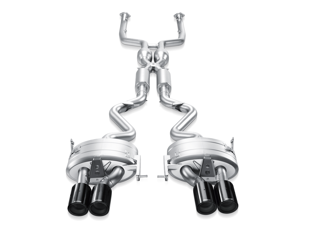 The Evolution performance exhaust system for the BMW M3 consists of dual-outlet mufflers, flow-optimized link pipes, and an X-pipe that incorporates high-flow 100 cpsi sports catalytic convertors and resonators. The power and torque gains of the BMW M3 with the Evolution system are just amazing. A substantial increase is detected over a very wide rpm range, and so it increases responsiveness during all phases of driving. Together with incredible weight savings, the Evolution system dramatically changes the power-to-weight ratio. Our goal was to design a system that delivers a deep, rich growl at cruising speeds while also allowing the driver to enjoy an aggressive roar when driving hard. Complete the look with a set of two exquisite tailpipes in titanium or carbon fibre.