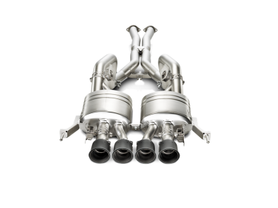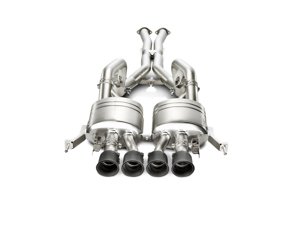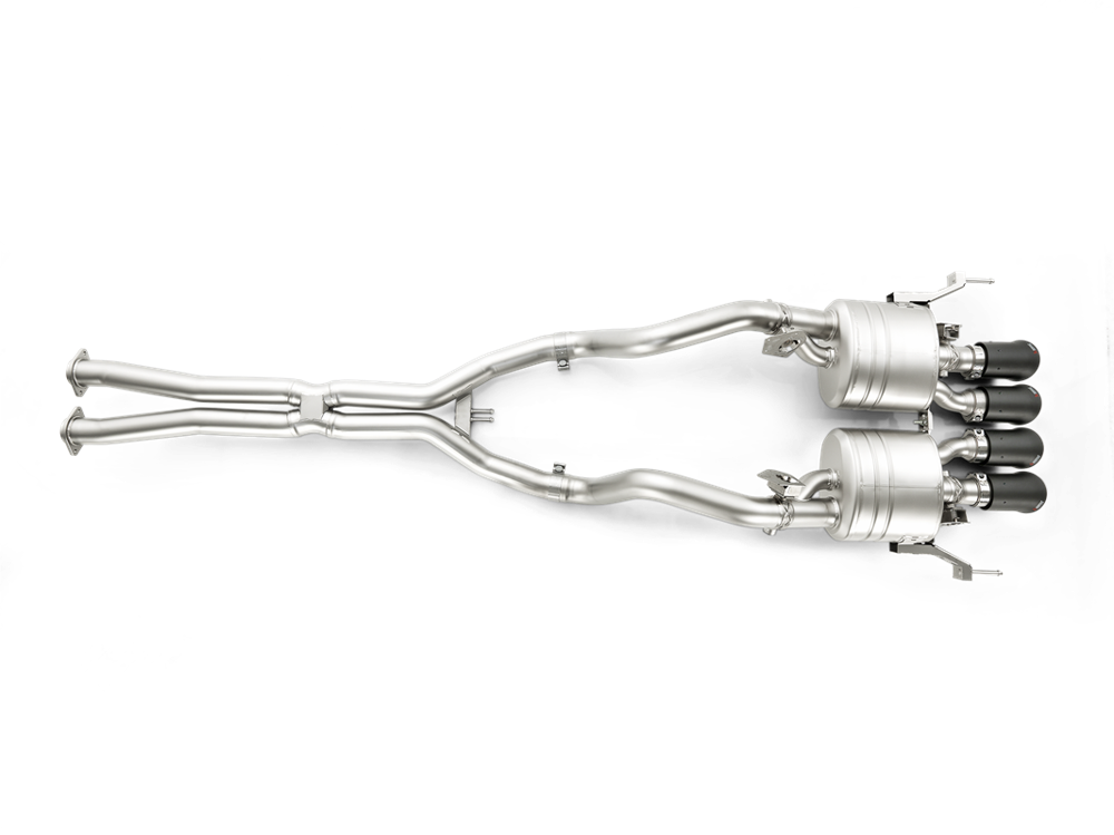 The Akrapovic Evolution Line system takes exhaust tuning to the next level. Featuring mufflers and link-pipes made from high-grade titanium to dramatically reduce the overall weight, the system provides more power, lowers back pressure, enhances throttle response, and increases torque. With four valves, the first pair operates in four-cylinder mode and the second set comes into action following the driver’s specifications. With an electronic device developed by Akrapovic engineers for the five standard GM modes—Weather, Eco, Tour, Sport, and Track—the system is perfectly matched to operate with the car’s drive mode selector. This produces an even greater range of options for the driver to fully experience the amazing sound of the car. The Evolution Line system, with a new X-pipe, provides even greater performance compared to the Slip-On Line system, and provides a pure race-note soundtrack for this stunning engine, with the enhanced sound characteristics of the V8 configuration and without any drone—just pure enjoyment. Four large-diameter carbon fibre tailpipes with titanium inners complete the appearance of the Evolution Line perfectly, making it stand out as something special.