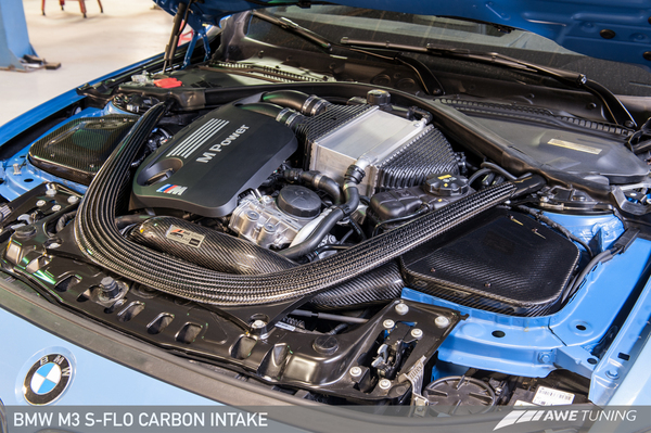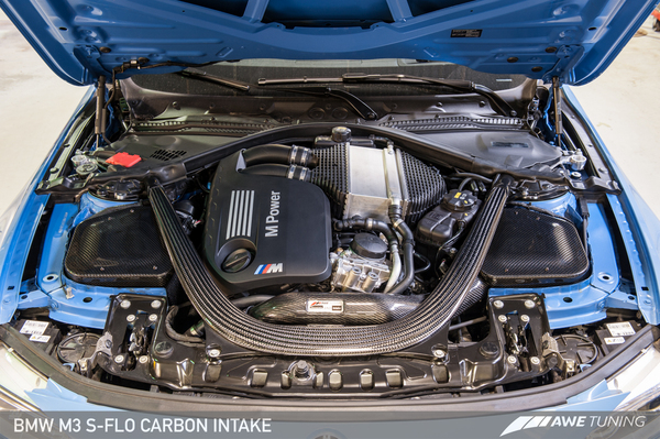 Presenting the AWE BMW F8X M3/M4 S-FLO Carbon Intake: The Carbon Fiber Air Boxes: The AWE BMW F8X M3/M4 S-FLO Carbon Intake is comprised of two fully enclosed carbon fiber air boxes that mount securely in the stock locations, engineered to match up perfectly with the factory air inlet pipes. Together with the AWE S-FLO Filters, the intake unlocks peak gains of 12 hp and 10 lb-ft of torque at the crank. Each carbon fiber airbox is crafted from high grade 2x2 weave carbon fiber with UV-stabilized resin and clear coat, which means no heat-yellowing. The S-FLO Filter: The AWE BMW F8X M3/M4 S-FLO Carbon Intake includes two S-FLO Filters specifically designed for the F8X M3/M4. These filters produce a more aggressive intake note, releasing a distinctive turbo spool sound. The included AWE S-FLO Filters use a proprietary design that is both durable and washable. Power, sophistication, and looks, alongside trademark AWE CEL-free operation and AWE's class-leading fitment guarantee. Breathe easy, F8X. Please note, AWE S-FLO Intakes are for racing use only.