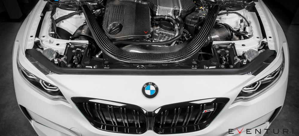 Below is a dyno graph showing the comparison between the Eventuri and the stock airbox on a M2 Competition. The car had no other modifications. As you can see, power and torque are increased through a large portion of the rpm range. This translates on the road to increased part throttle and full throttle response with the car pulling much more eagerly to the redline. The testing was done on the same day back-to-back and temperatures were monitored to ensure consistency. The hood was closed for all runs.
