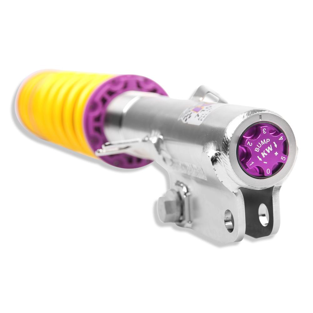 If you have already made your first performance modifications to your vehicle our KW V3 coilover will compliment your upgrades. The patented KW-valve technology for separate adjustment of rebound and compression damping allows you to individually setup your suspension.The adjustable KW bottom valve adjusts the low-speed range of the compression level in twelve clicks.