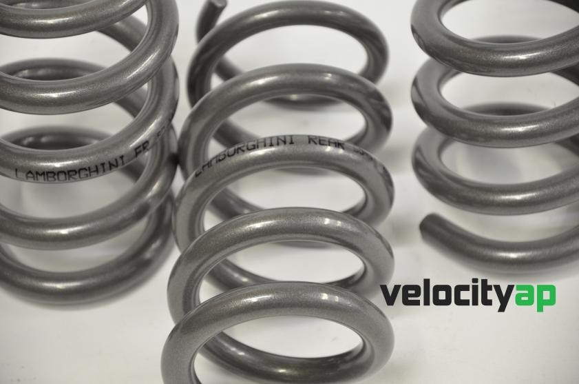 VelocityAP lowering springs for 2014-on Lamborghini Huracan, to reduce the ride height on your car by 7/8" at the front, or 22mm, and 1 1/8" or 32mm at the rear. The Huracan on stock/OEM springs sits slightly higher at the front than at the rear. Our kit levels the suspension, produces a great visual improvement but rides just like stock, with no loss of ride quality VelocityAP springs use exclusively high quality, high stress X5K Spring Steel. Although considerably more expensive than regular steel, this new generation steel allows us to further improve upon the original Lamborghini spring design by reducing the amount of steel required in a spring. VelocityAP springs are therefore substantially lighter (by approximately 30%) and reduce the solid height therefore increasing travel. X5K Spring Steel is used in almost all top levels of Motorsport, giving a hugely successful endorsement of its characteristics & proven durability.