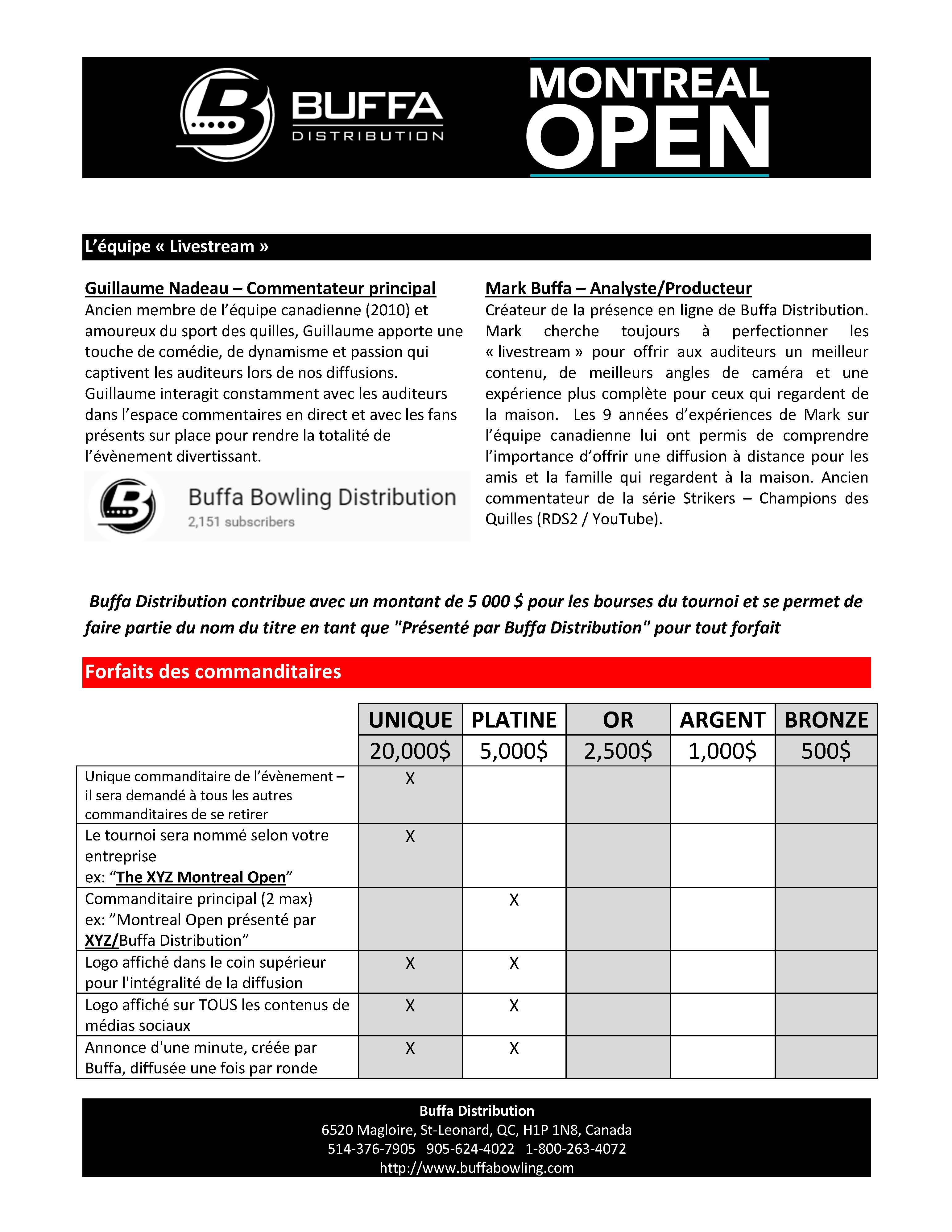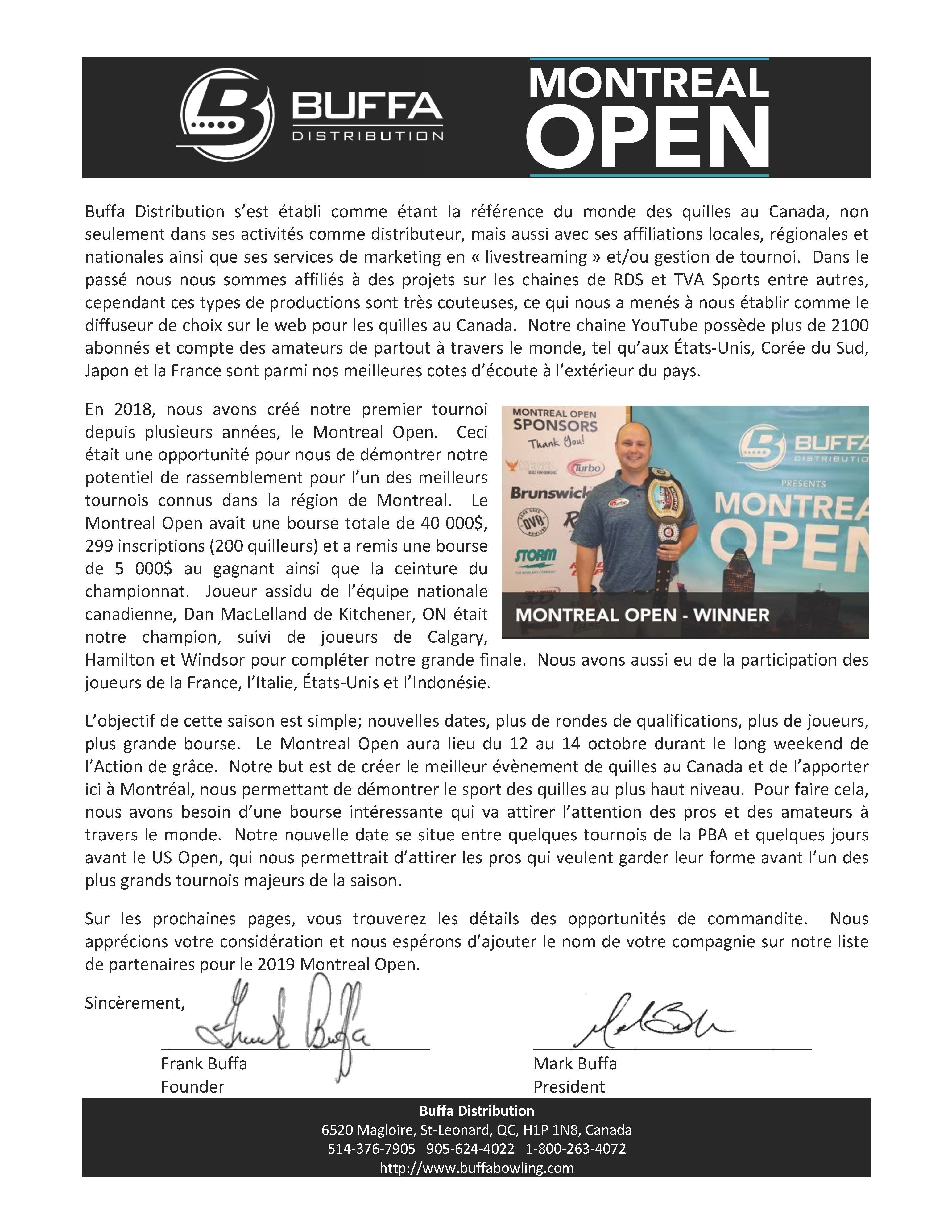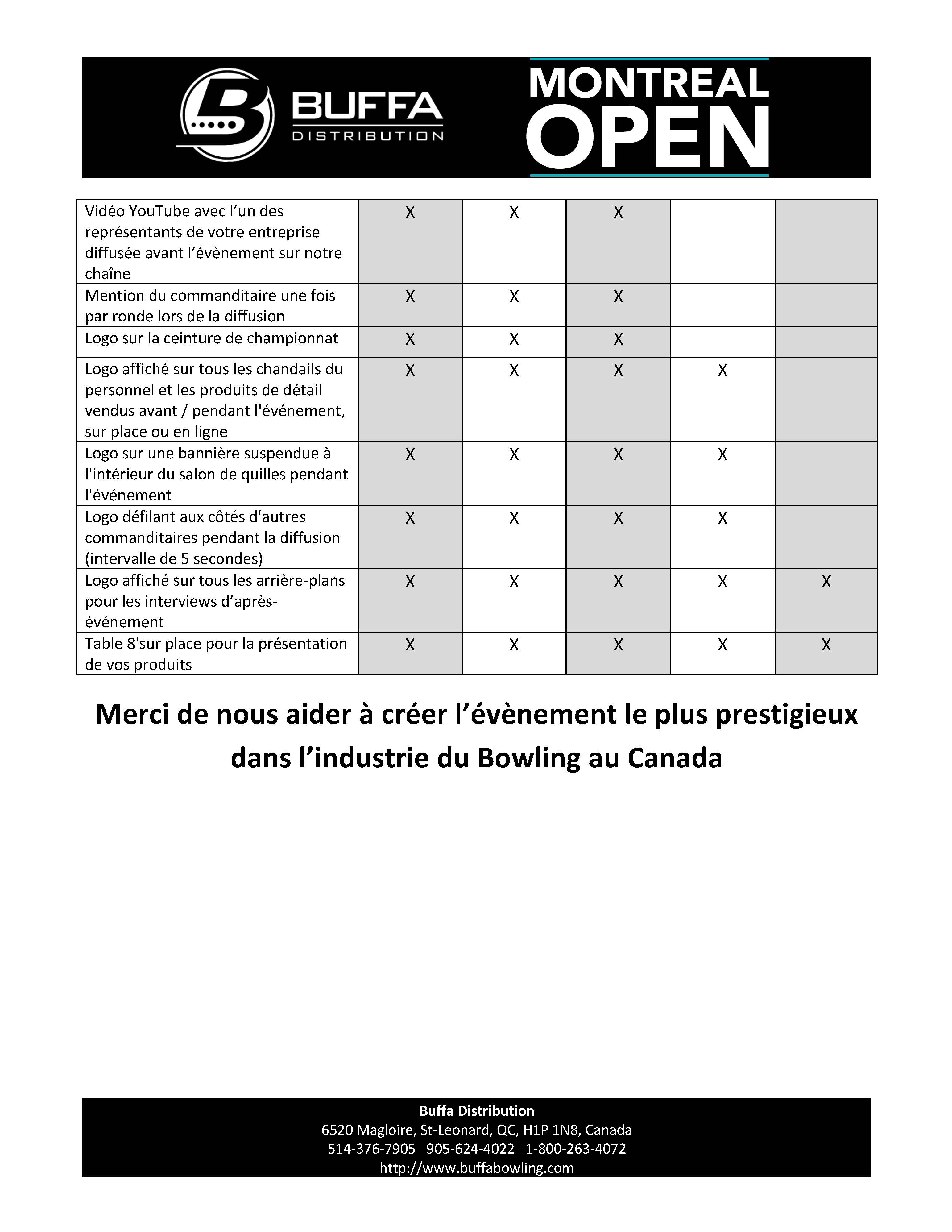 Le Montréal Open 2019 ne serait pas possible sans nos commanditaires. Nous aimerions profiter de cette occasion pour remercier toutes les personnes qui nous aident à rendre cet événement possible. Chez Buffa Distribution, nous travaillons fort pour que notre sport reçoive l'attention qu'il mérite. Voici la liste de nos commanditaires: