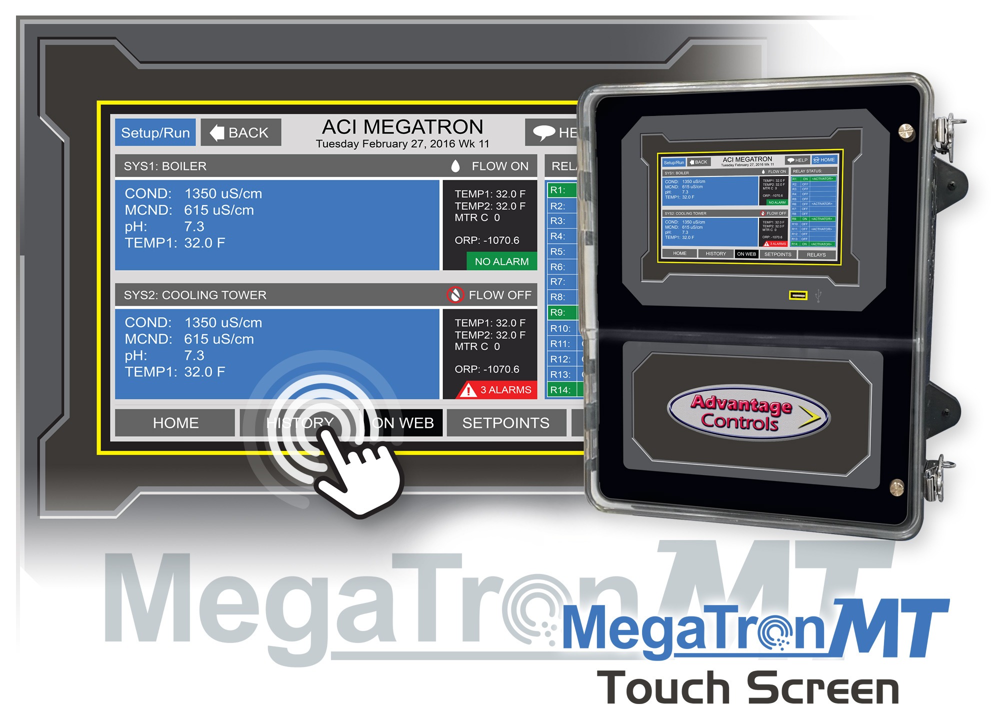 The MegaTronMT is a powerful, fully integrated controller designed for continuous monitoring and control of industrial water treatment systems, including cooling towers, boilers, and wastewater applications. With its large, full-graphic touchscreen display and intuitive interface, the MegaTronMT simplifies setup, operation, and data access.