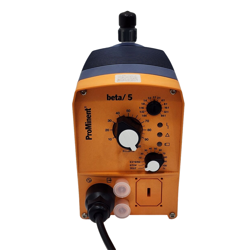 The ProMinent beta is a microprocessor-based diaphragm solenoid metering pump capable of flows from 0.16 to 8.45 gph (0.59 to 32 l/h) and pressures to 363 psi (25 bar).