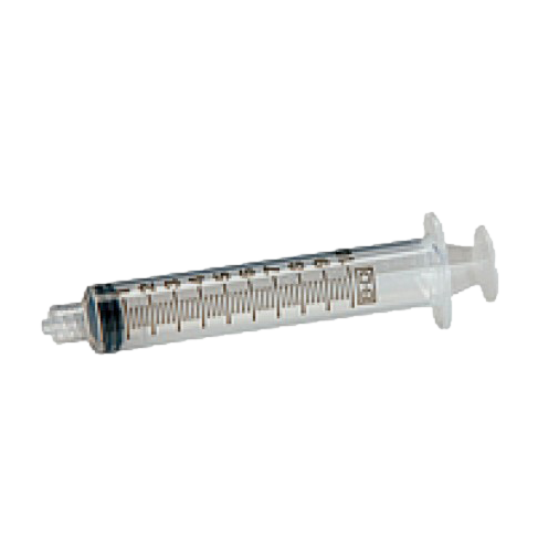 Plastic syringes capable of holding 10 mL.