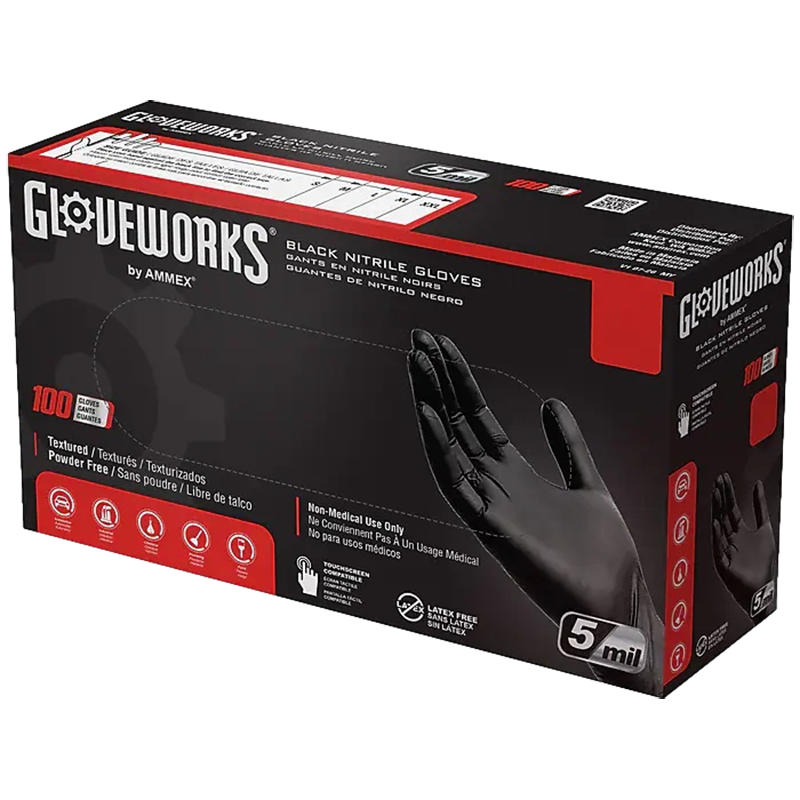 The Ammex Gloveworks black nitrile powder-free industrial glove will get as down and dirty as you need. It's the disposable glove that won't quit on you. This premium industrial-grade nitrile glove is the perfect combination of strength, dexterity, and comfort. The glove is more than 50% thicker than standard nitrile gloves, which adds durability, and that means fewer glove changes over the course of a shift. Nitrile has three times the puncture resistance of latex, and at 5-mil thickness in the palm with 6-mil fingertips, the glove holds up when working with tools and machinery.