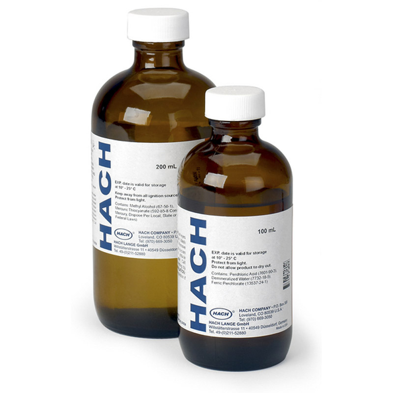 For colorimetric chloride determination by the mercuric thiocyanate method. Hach method 8113. Range: 0.1 to 25.0 mg/L Cl- 200 mL bottle