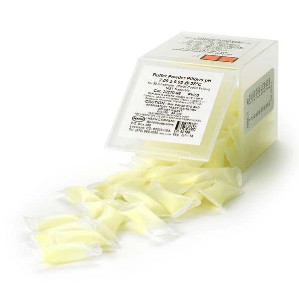 pH Buffer Powder Pillows for pH electrode calibration. Each powder pillow prepares 50 mL of fresh buffer solution. Color-coded for easy identification (Yellow). pH is 7.00 ±0.02 at 25°C. Pack of 50 Powder Pillows