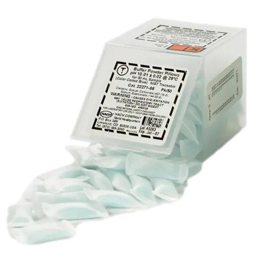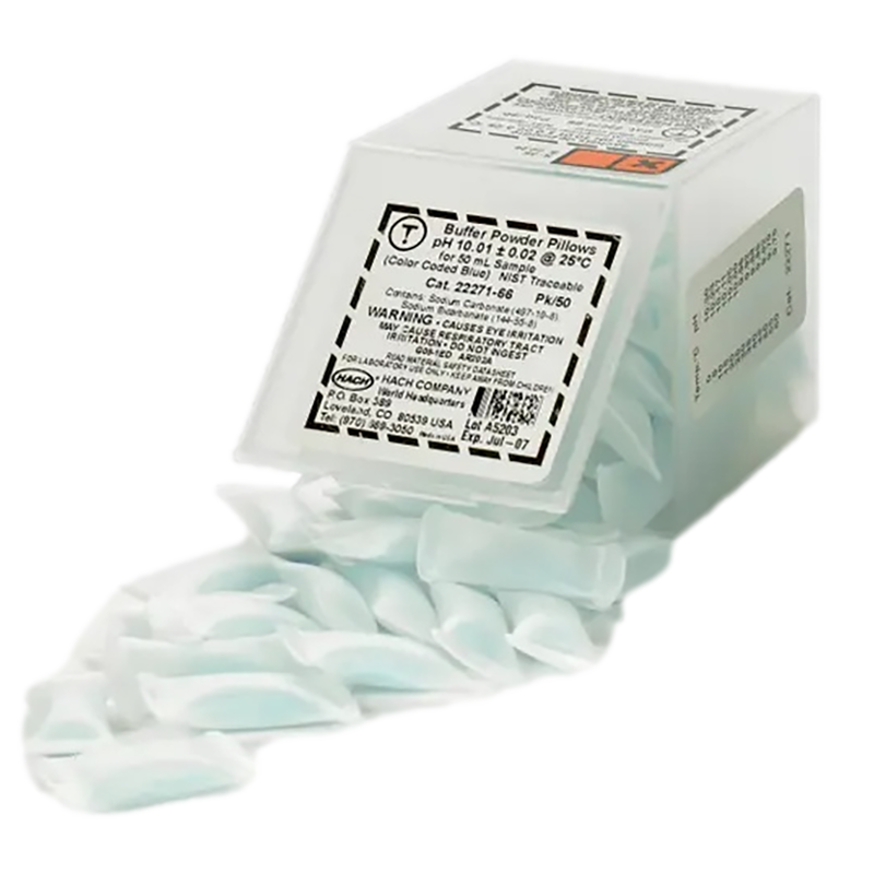 pH Buffer Powder Pillows for pH electrode calibration. Each powder pillow prepares 50 mL of fresh buffer solution. Color-coded for easy identification (Blue). pH is 10.01 ±0.02 at 25°C. Pack of 50 Powder Pillows