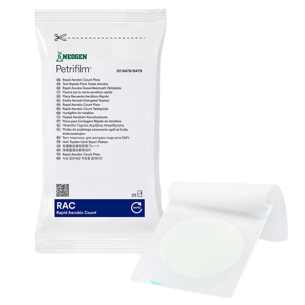The Neogen® Petrifilm® Rapid Aerobic Count Plates are a sample ready, culture medium system, which contain nutrients, a coldwater soluble gelling agent, and a dual sensing indicator technology that facilitate colony enumeration in 24 hours for most food matrices and environmental samples. Proven as reliable as the SMA plate method, Petrifilm Rapid Aerobic Count Plates help agar users avoid costly retesting and delayed results due to interpretation issues caused by spreader colonies. Aerobic count bacteria are present in a variety of food matrices and serve as indicators for food spoilage. Getting accurate aerobic bacteria counts in your raw materials, finished product and production environment are critical to making time sensitive decisions that impact process control, cleaning decisions and, ultimately, product quality and safety.
