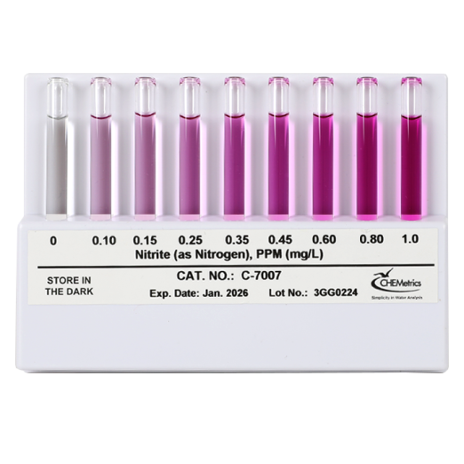 C-7007 Nitrite High Range Comparator is a component of K-7006 Nitrite CHEMets Visual Test Kit and is designed to be compared against the color formed in R-7006 Nitrite CHEMets Refill. The comparator’s range is applicable to many industrial and environmental applications. Color standards are pink in color and cover a range of 0-1.0 mg/L nitrite (as nitrogen).