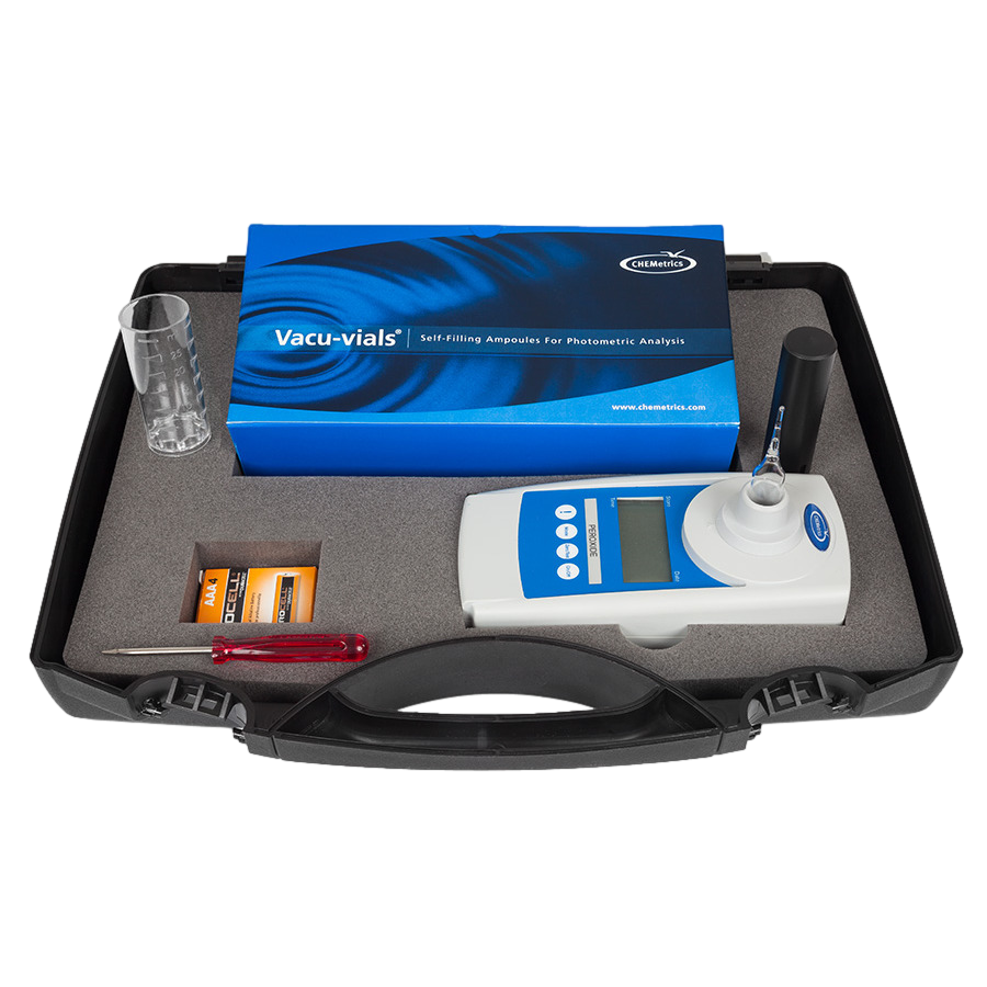 The I-2022 Low Range Ozone SAM Kit comes in a plastic case and contains everything needed to perform 30 tests: Vacu-vials® ampoules, SAM Photometer, 4 AAA batteries, screwdriver, and instructions. This kit is great for drinking water, bottled water, or other applications where low concentrations of ozone need to be measured in water.