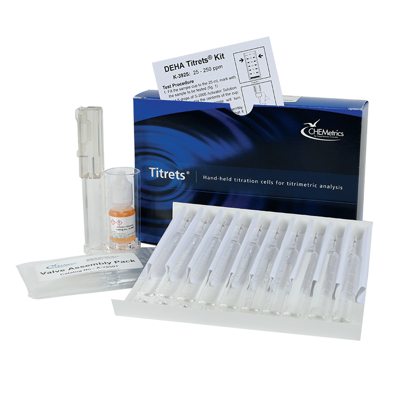 DEHA Titrets® test kit (25-250 ppm) comes in a cardboard box and contains everything needed to perform 30 tests: thirty ampoules with valve assemblies, Activator Solution (A-3900), titrettor (A-0053), 25 mL sample cup (A-0013), and instructions.