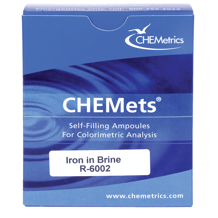 The CHEMets® R-6002 Iron in Brine Refill is designed for use with the K-6002 Visual Test Kit for the analysis of iron content in brine solutions using the Ferric Thiocyanate method. This refill contains 30 self-filling CHEMets ampoules, securely packaged in cardboard trays and a durable box. It is compatible with both the C-6002 Low Range and C-6012 High Range Iron Comparators, offering flexible detection across a range of concentrations in high-salinity environments.