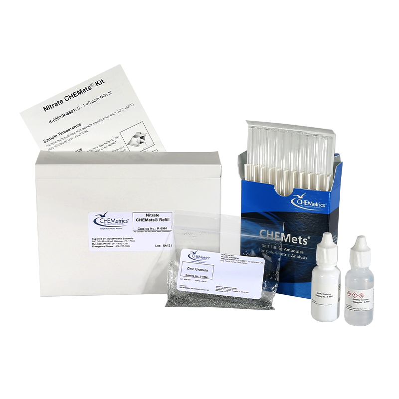 The CHEMetrics® CHEMets® Nitrite Refill (R-6901) is designed for continued use with CHEMetrics Nitrate CHEMets Visual Kits. This refill supports accurate nitrate analysis in water using the Zinc Reduction–Azo Dye Formation (NED) method. The kit includes 30 self-filling CHEMets ampoules along with all required reagents, securely packaged for safe storage and handling, making it ideal for routine laboratory and field testing.