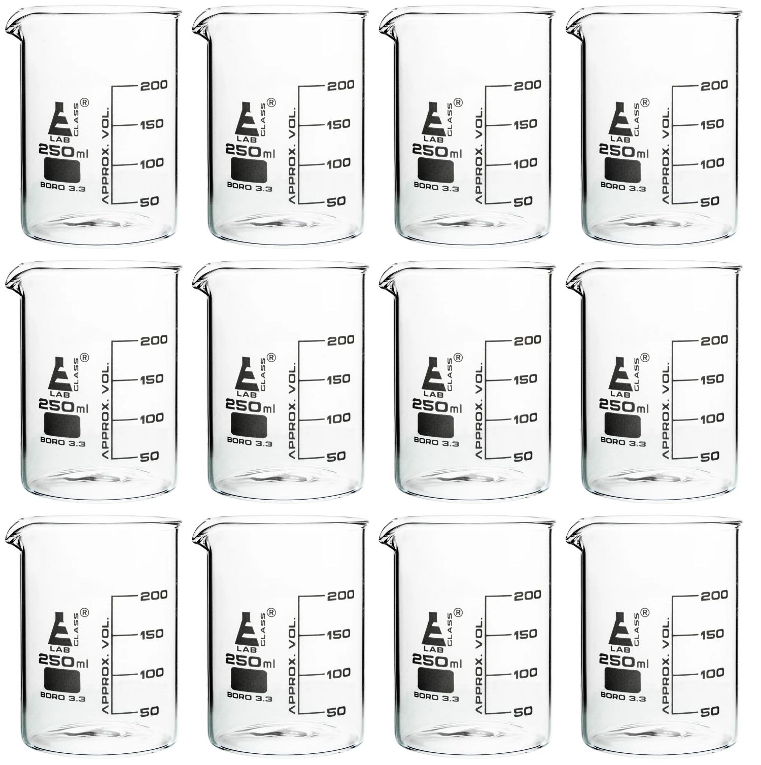 Pack of 12 low form Griffin beakers made of Borosilicate 3.3 Glass. Each has a 250ml capacity. Beakers feature white graduation lines, marked every 50ml, as per DIN 12231. Spout for easy pouring. Uniform walls provide excellent strength against breakage.